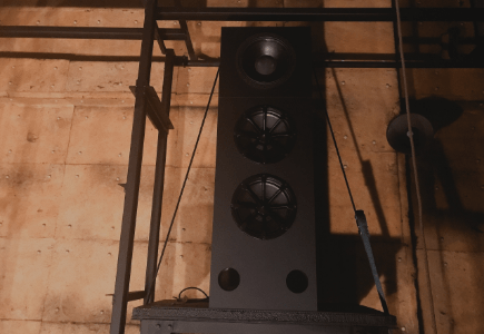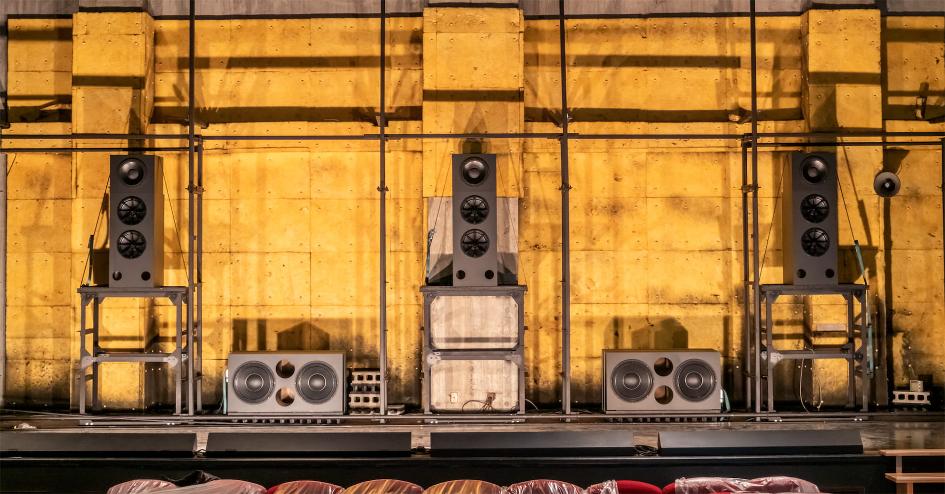 メインシステムは、コアキシャル(同軸)型3ウェイ・シネマシステムを導入。高域・中域を1箇所から出力する事により、位相干渉を無くし、距離による偏差を少なくしています。また地を這うような低域が特徴的な2つのウーハーから出力されます。